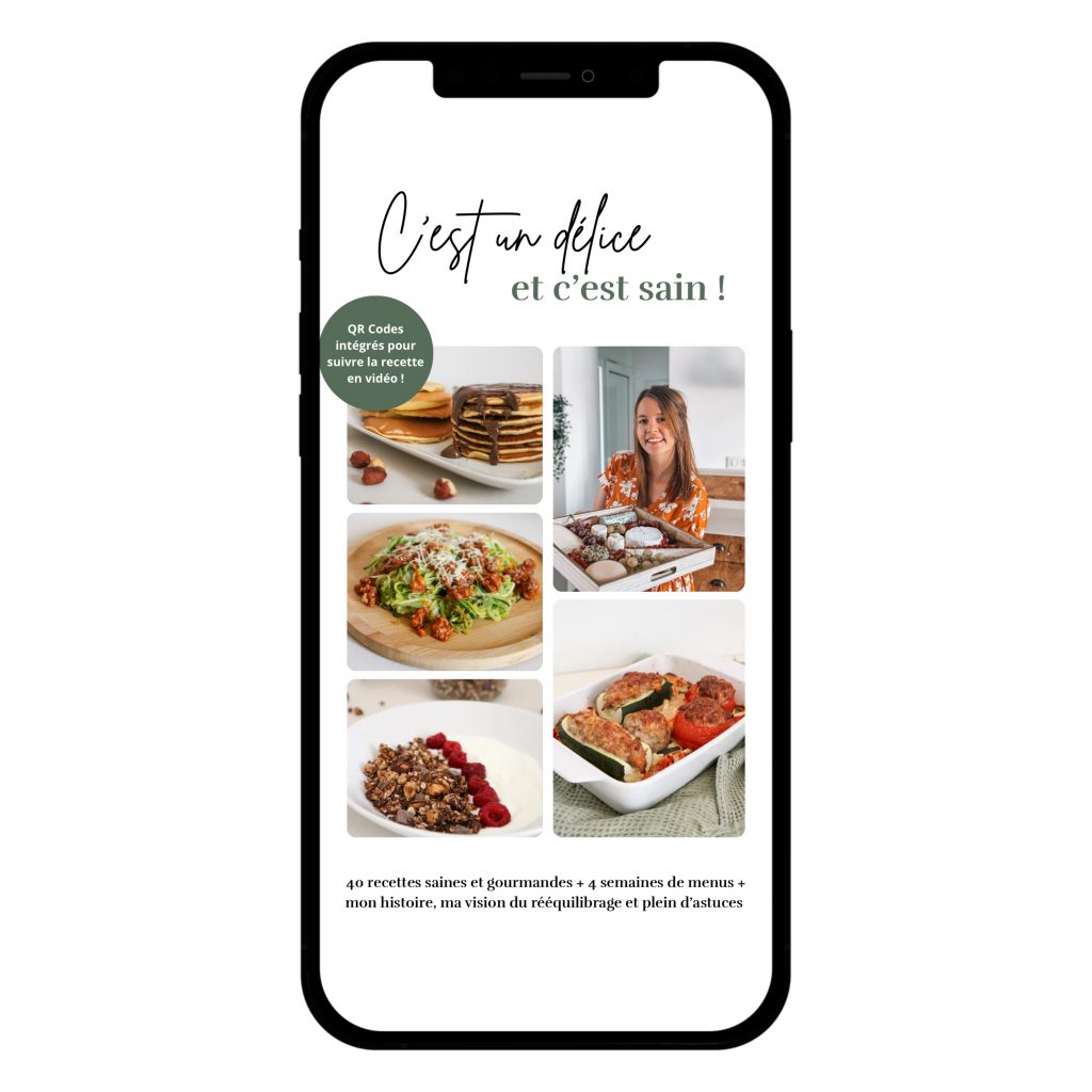 40 recettes saines et gourmandes + 4 semaines de menus + mon histoire, ma vision du rééquilibrage et plein d’astuces
