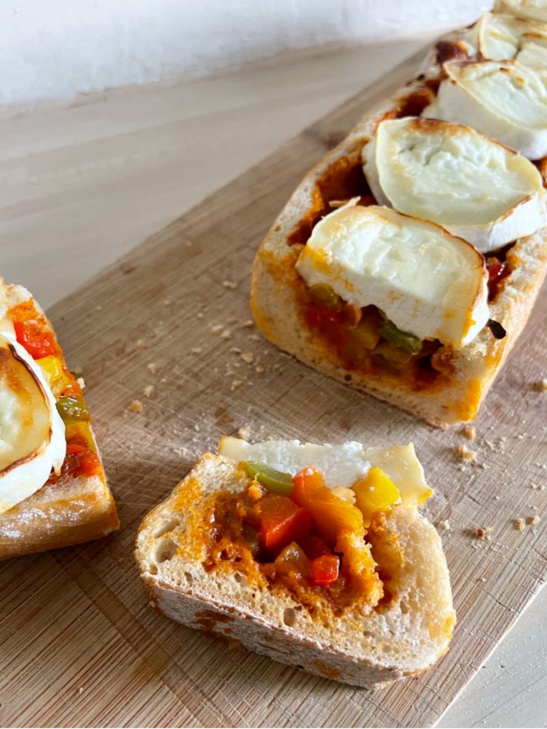 La baguette farcie version été Parfaite pour l’apéro, cette baguette farcie aux poivrons, à la sauce tomate et au chèvre combine la gourmandise et l’équilibre Vous pouvez retrouver la version hiver en cliquant juste ici à base de reblochon La recette en format PDF est juste ici La vidéo instagram ici