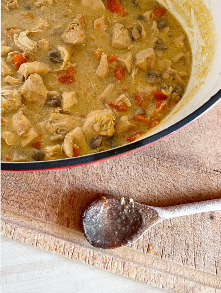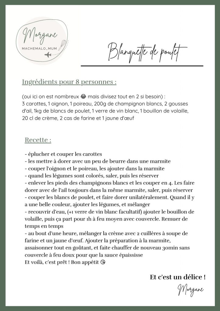 Blanquette de poulet Le repas familial, pas très glamour, mais tellement bon, et encore meilleur fait la veille On laisse mijoter et c’est ce qui fait toute la gourmandise. Avec des pâtes ou du riz, vous m’en direz des nouvelles ! La recette en format PDF est juste ici La vidéo de la recette ici