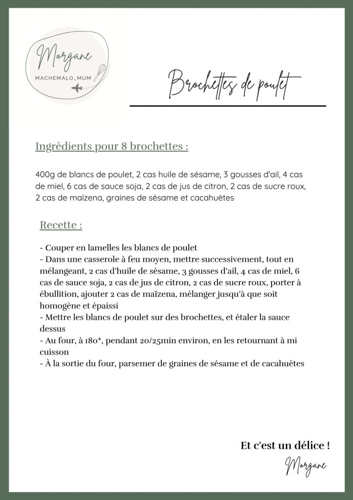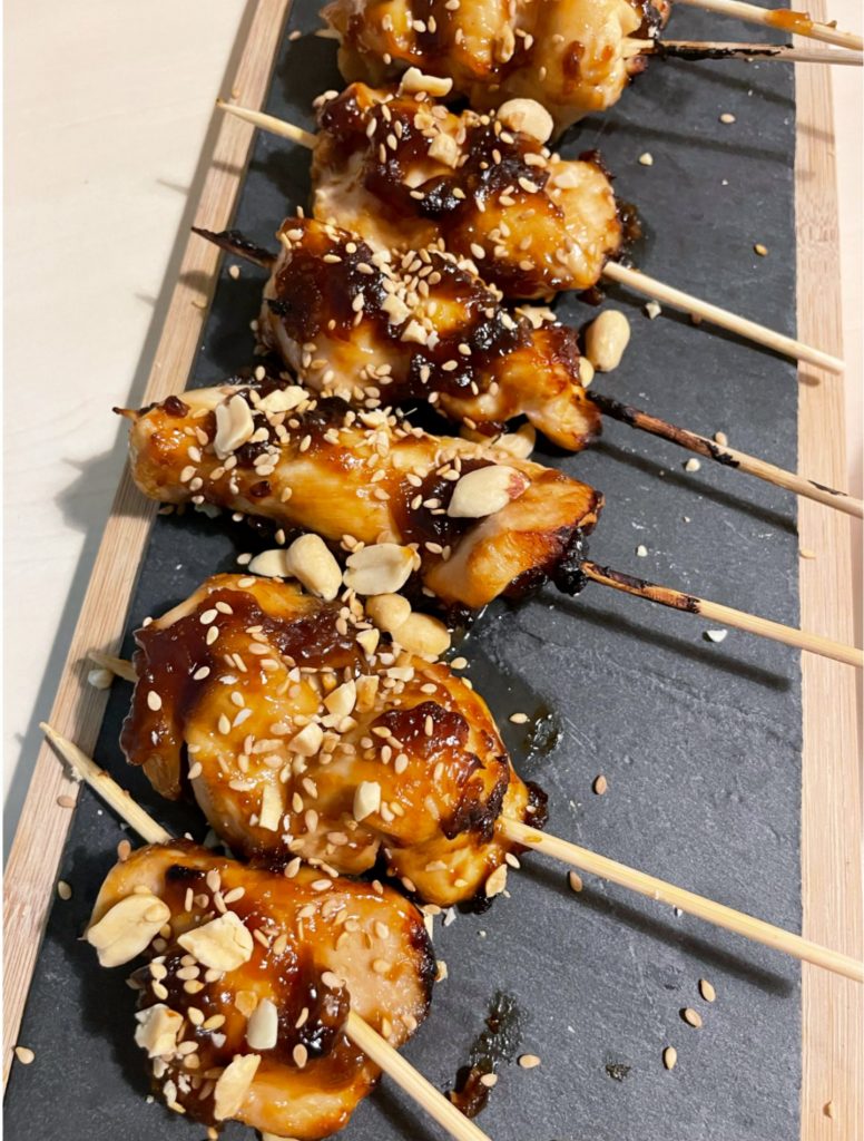 Brochettes de poulet A grignoter à l’apéro, ou, en guise de plat accompagnées de riz, ces petites brochettes sucrées/salées de poulet, aux saveurs asiatiques, sont des pépites La recette en format PDF est juste ici La vidéo de la recette ici