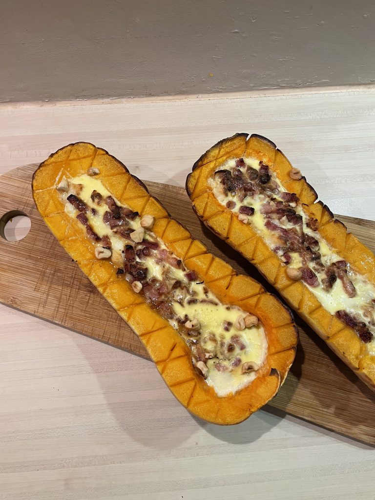 Butternut farcie 🎃 C’est tout simple, variable à l’infini, et de saison : que demander de plus ? Pour la version j’y ai mis du chèvre, des lardons, des oignons et quelques noisettes torréfiées 🌰 J’accompagne ça d’une bonne salade et c’est un délice !