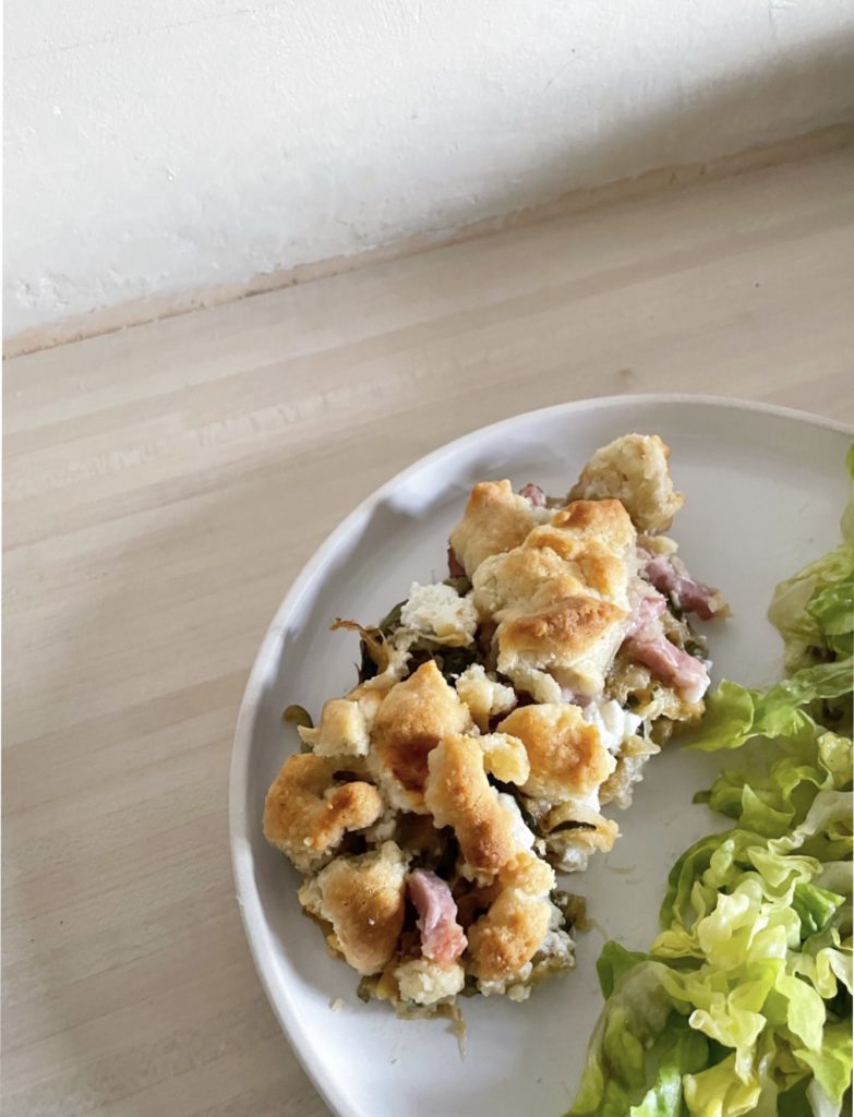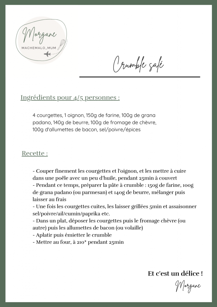 Crumble salé Le plat idéal pour varier les plaisirs, car comme le sucré : on y met la garniture que l’on souhaite, et la base reste la même Ici, j’ai décidé de le faire aux courgettes/chèvre/bacon. On l’accompagne d’une belle salade est le tour est joué !