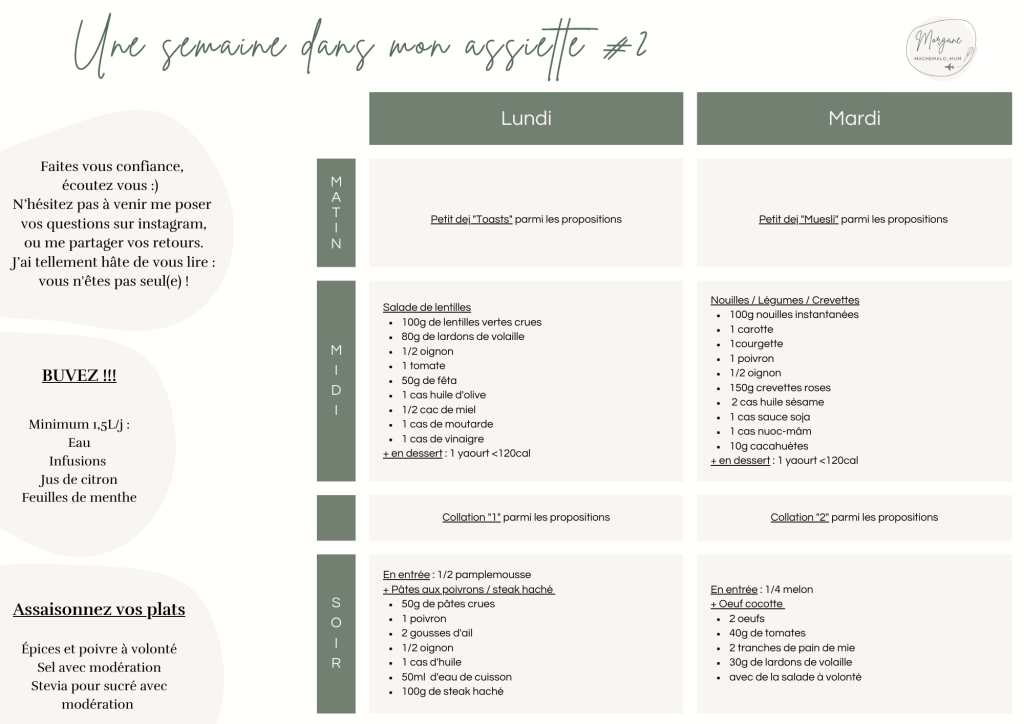 5/ Préparation des plats : La plupart des plats peuvent être préparés à l’avance. Les repas du jeudi midi et vendredi midi sont identiques, pour gain de temps et facilité, donc pensez bien à doubler les quantités au moment de la préparation. Les recettes en vidéo sont à retrouver en story à la une sur Instagram.