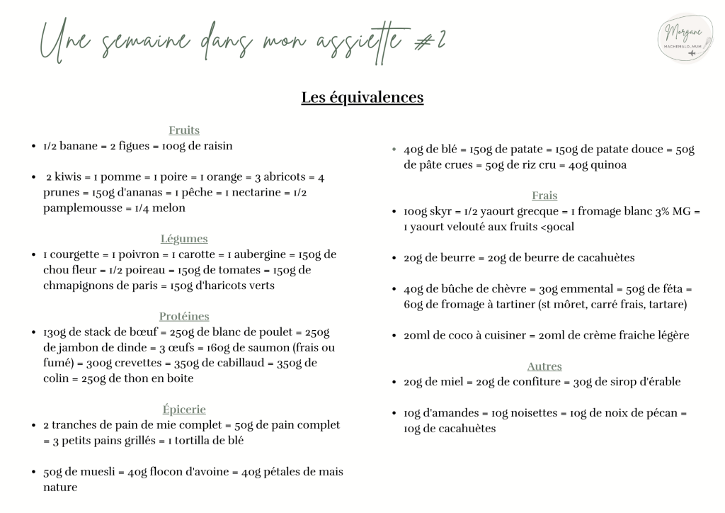 2/ Je n’aime pas un aliment proposé ? La plupart des aliments ont une équivalence. Je vous ai donc fait un document « Équivalences » qui vous explique comment remplacer.